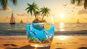 Prompt A surreal tropical sunset scene where a glass of orange juice contains a miniature island inside — with palm trees, blooming flowers, an orange slice, and clear blue water. Inside the liquid, dolphins swim among underwater plants and coral. Waves gently move inside and outside the glass. Dolphins occasionally leap out of the water. Birds fly slowly across the colorful sunset sky. … The glass sits on a sandy beach, with the real ocean, sailboats, and a golden sunset in the background. Cinematic 3D animation, macro perspective, magical realism style.